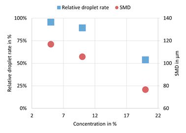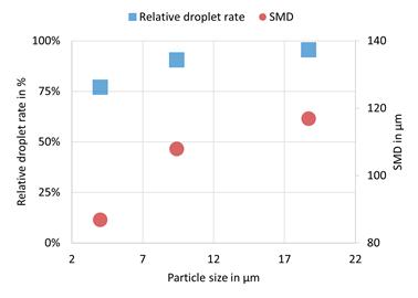 Figure 2: Correlation of relative droplet rate and droplet size by SMD (left) with suspension concentration and (right) with size by SMD of suspended particle