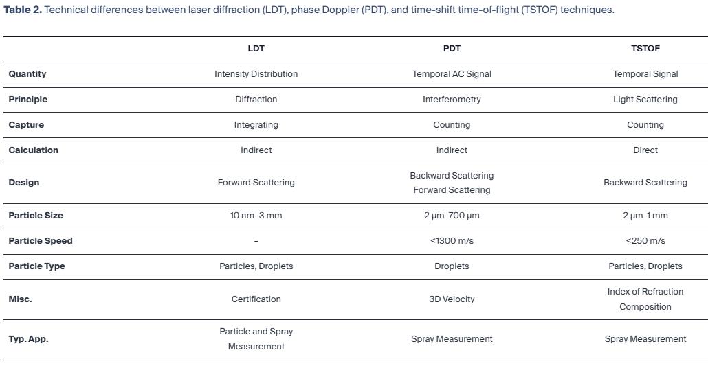 In this paper, we discuss the functionality and historical development of the Time-Shift Time-of-Flight (TSTOF) technique. In addition, we compare TSTOF with laser diffraction and Phase Doppler techniques to identify the respective application ranges of measurement instruments based on TSTOF, such as ParticleTensorAI®, SpraySpy®, and SprayQuantAI®.